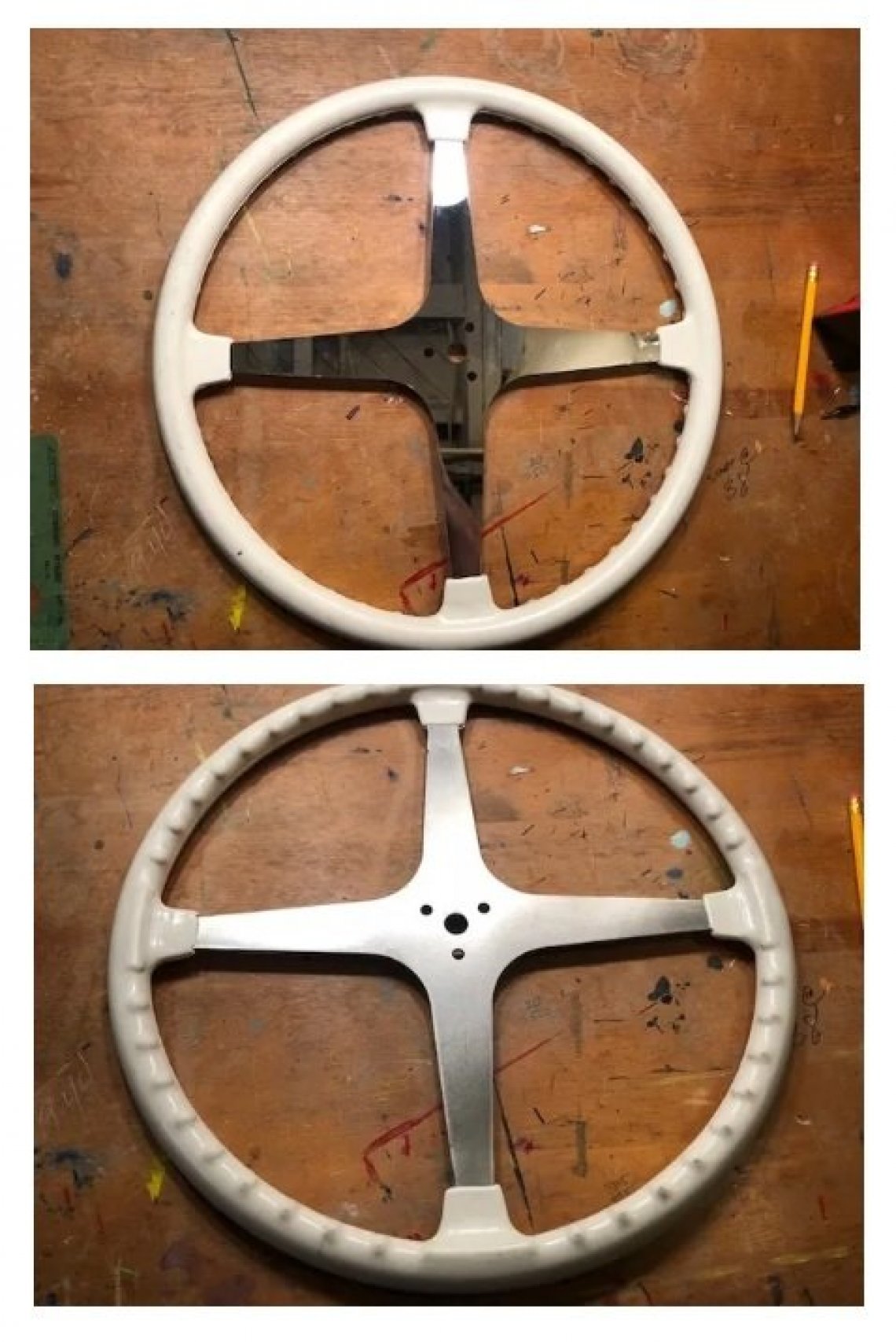 HOT ROD 17" Four Spoke, White Grip, Polished Stainless Center, 3 bolt. This "Hot Rod" wheel comes with the Industry standard 3 bolt mounting pattern. Center hole is .625 (5/8") Back side of steering wheel is Sand finished. Outside to outside measures 17.5" (44.50cm)