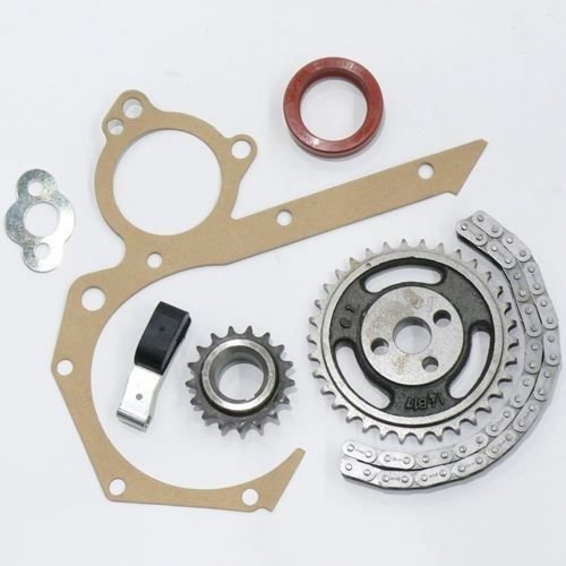 Kit completo de cadena de distribución que contiene: rueda dentada del árbol de levas, rueda dentada del cigüeñal, cadena de distribución, sello delantero del cigüeñal, almohadilla del tensor de cadena, lengüeta de bloqueo de la rueda dentada del árbol de levas y junta de la bomba de agua/tapa delantera.